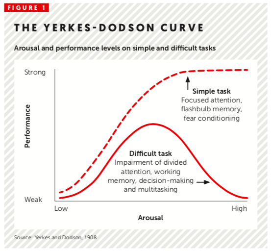 However, the effects can turn negative in two ways. First, the stress response is best suited to simple tasks, like escaping physical danger. Our performance on complex tasks can be improved by moderate stress, but only up to a point (see Figure 1), beyond which performance suffers: focus becomes tunnel vision, cognitive performance becomes reflexive panic, physical sensations of anxiety become inhibiting, and our social information-processing tilts towards attributing hostility to ambiguous actions. All of these work against innovation.
