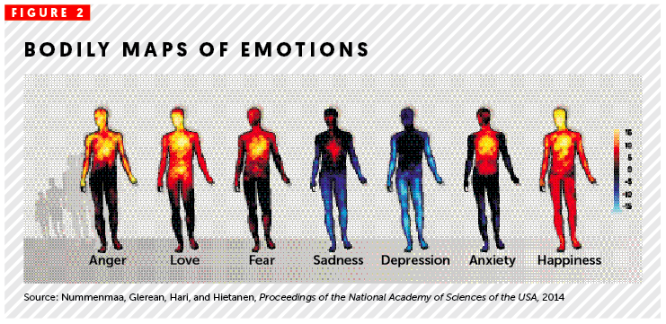 Our body is constantly giving us data. Each emotional state creates a corresponding sensation in the body. For example, when I’m angry, I feel heat in my cheeks, a tightness at the top of my throat and pressure in my chest. Researchers have mapped where people feel activation in their bodies, as Figure 2 shows (‘Bodily maps of emotions’, Nummenmaa, Glerean, Hari, and Hietanen, Proceedings of the National Academy of Sciences of the USA, 2014). Learning these signals is a powerful way of bringing awareness to your emotional state, which is critical, because the parts of the brain responsible for emotional body awareness are also the parts that work on emotional regulation.