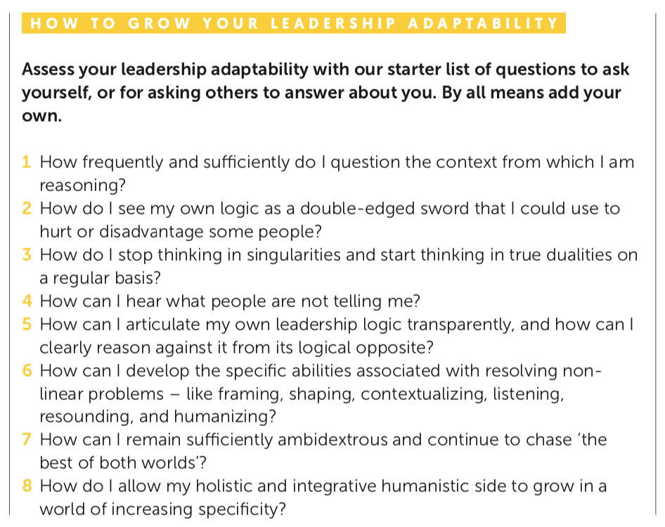 Answering those questions can help you to understand others, be clearer in your intentions, and come out with decisions that are better supported by those in your organizations and communities. That is the true value of adaptability. The logic of duality isn’t hard to master, as long as we focus on positively-framed and desirable opposite value propositions, and stop pitching one value against another. Such either/or thinking means putting leaders at odds with each other in divided organizations, in an already too-fragmented world.