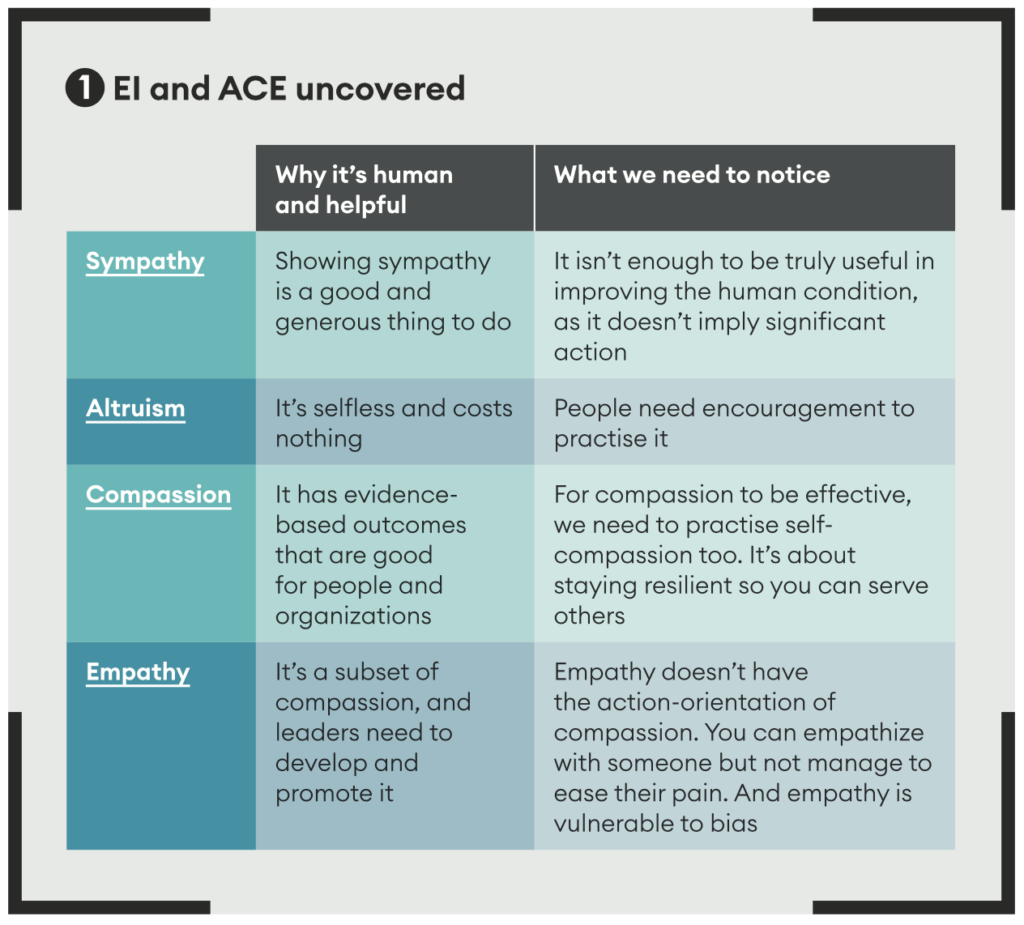 The acts of altruism, compassion and empathy (ACE) visible around the world since the pandemic hit are cause for optimism. They speak to humanity’s enduring emotional intelligence (EI) and, having (re)discovered the power of ACE during this crisis, we must now continue to harness its power, applying it in a sustainable way to help everyone. The application of EI and ACE concepts can be used to fuel a shared purpose and the achievement of organizational objectives.