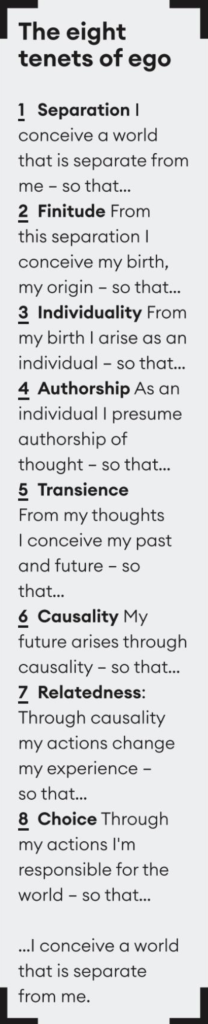 Ego is constructed around eight core beliefs – the tenets of ego – which afford our sense of free will and authorship. It is the belief that when we act, when we think, when we choose, when we breathe and when we die, that all of this happens to us as an individual, separate self.