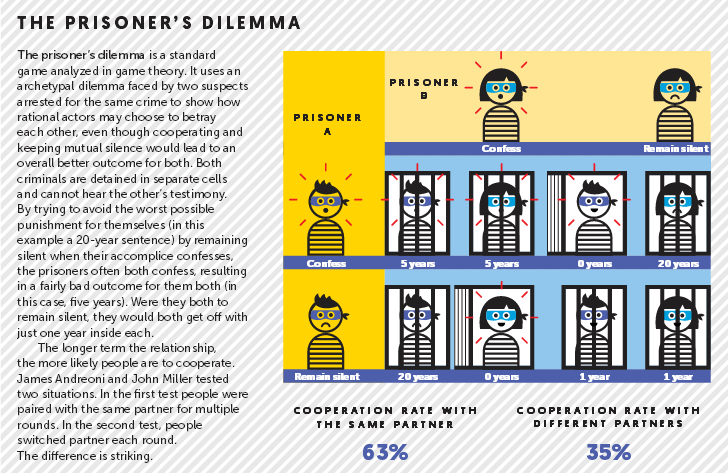 Imagine two new people join your team at work. One is on rotation for a week and the other will be your partner for the next three years. Who do you feel more invested in? Who are you more likely to trust? Professors of economics and social science James Andreoni and John Miller (1993) tested the effect the length of a relationship has on our tendency to trust others. In a typical prisoner’s dilemma game (see infographic, page 20), players can either look out for themselves or cooperate with their partners. If both parties cooperate, both benefit. If not, the player who cooperated is hurt. Andreoni and Miller tested situations in which people were paired with the same partners for multiple rounds, or switched to a new partner each round. They found that with consistent partners, and thus a chance to build a good reputation over repeated interactions, people were much more trusting: they cooperated 63% of the time, compared to the 35% cooperation rates when partners switched after each round.