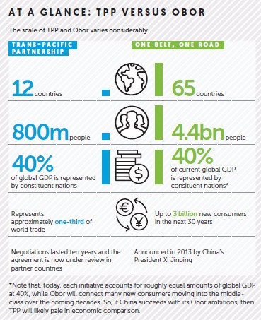 Trade compared to connections Given that questions about Obor are asked while TPP is being ratified by participating countries, it is perhaps inevitable that we ask how Obor compares to TPP. In the simplest of terms, trade deals like TPP will become an important part of Obor. These agreements lower barriers and open up the flow of goods and services between partner countries. These flows will only increase as infrastructure projects related to Obor are completed.