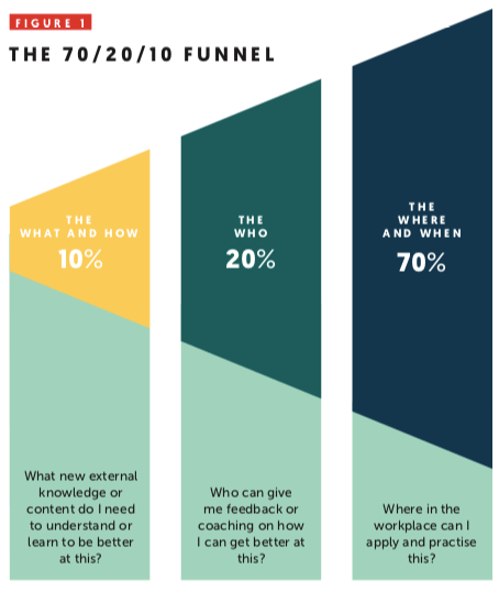 Employee development goals are more likely to be achieved when 70/20/10 is used as an integrated model. I describe this as a learning funnel. I like to use the model to set out areas of inquiry, beginning with the 10% and moving through to the 70%. This flow ensures that development activities are aligned.