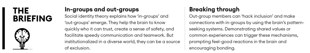 Yet out-group members often fall into the trap of thinking that in-group members alienate those on the outside consciously, 100% of the time. Of course, there is no excuse for unjust group behavior, be it racism, misogyny or any other form of prejudice and injustice. But my experience – both consulting to leaders and being an out-group member for much of my professional life – is that more often than not, the majority of in-group members are very open to bonding with those who are different from them. The question is how.