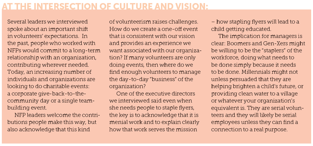 These NFP leaders strive to create a culture that values accountability and results. People must want to be there and feel included. And, they also need to know that there are standards to meet. As one interviewee noted, when she herself volunteers, “the staff takes it seriously, so I feel I should as well.” The people who come to work with those organizations know their efforts have a positive effect and are pleased to be part of something great. They are looking for an experience where they can use their skills (or learn new ones) to make a difference.