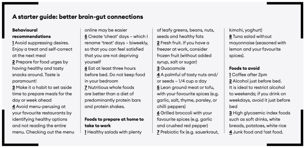 She complained of a feeling of ‘brain fog’ and had recently developed a skin rash. It became clear she was not getting enough whole foods in her diet. She had been promoted at work, was traveling more, inhaling quick airport meals and fast food, and feeling increasingly stressed. We worked on a personalized nutritional psychiatry meal plan, including foods made for travel such as pre-prepared fruit and veggies, helping cut out late-night sugary snacks. She started to pack mini sachets of almond butter, picked up celery and hummus for her bar fridge, and added healthy sides whenever she ate out. She stuck to lean proteins or fish with a side salad and vegetables. I challenged her: how many different colors of fresh vegetables could she add in a day? This made a game out of dietary change: she would compete with herself and began increasing the biodiversity of her foods, making her gut healthier and happier. The brain fog lifted, and her skin rash began to fade, without medication.