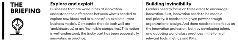 What makes a business world-class at innovation? The companies we work with all invest a substantial amount of resources in innovation – yet they are almost always frustrated by the progress of their innovation teams. In our experience, this is usually the result of leaders failing to make a distinction between the way they manage their current business and how they should govern their innovation portfolio. Managing the existing and inventing the future requires two fundamentally different cultures that live side-by-side and co-exist in harmony. It means simultaneously exploiting the current business and exploring the future.