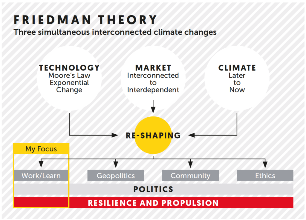 The Age of Accelerations comprises three exponential growth and change trends: technology (Moore’s Law), the market (interdependent global markets), and the climate (climate change, biodiversity loss, population growth). Technology is measured by the relentless march of Moore’s Law, which has delivered computing power at low enough cost that now anything mentally routine or predictable – perhaps half of all work – can be replaced by technology. The market has moved from being connected, to hyper-connected, to interdependent – forcing failures and successes to be absorbed by all. Climate change not only drives shifts in energy markets (driving down the cost of solar to compete with cheap coal, for example), but also changes in human migration, as super storms, drought, and other conditions drive people from their homelands to seek safety and economic advantage elsewhere. Friedman argues that these three interlocking accelerations are redefining geopolitics, politics, community, ethics and –perhaps most of all – learning and work. Change runs blindingly fast up an exponential curve, demanding that we think differently about work and learning.