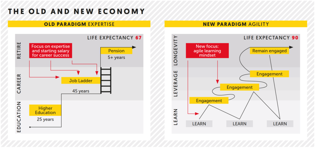 That single dose of education stockpiled in our twenties will barely last into our thirties. And that 40-year career arc is stretching to 50 or more years, as we live longer, healthier, and more engaged lives. Where we once jumped on the career ladder and climbed to retirement, workers now navigate a complex maze of ever-changing possibilities. Traversing this maze will require not just stored knowledge and experience, but a flexible and ready ability to learn, adapt, collaborate and create.