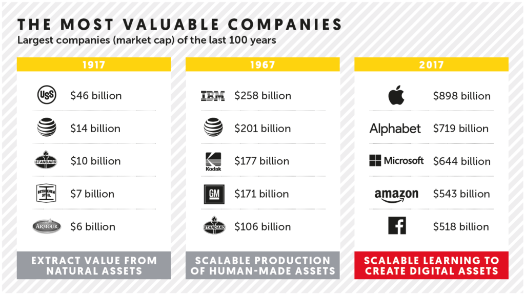 Fifty years ago, the most valuable companies were automotive, telecommunications and chemical companies that scaled production capabilities with skilled labour. This shift toward production of manmade goods in the post-war era drove people en masse to seek higher education, filling the pipeline from classroom to factory with workers trained to specific roles.
