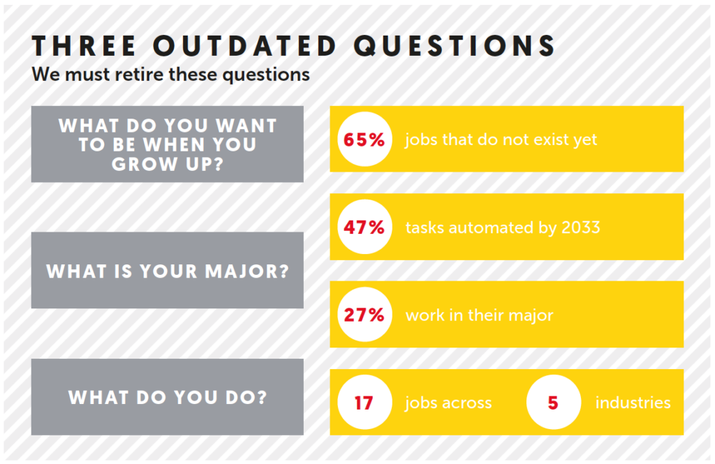 This is a tectonic shift in identity from external validation (for example, a degree or a job title) to internal validation, tapping into intrinsic motivations to learn and adapt for life in pursuit of our aspirational selves. Studies have shown that recovery from a job loss today can take twice as long as the grieving period for the loss of a spouse. This indicates a vulnerable sense of self subject to the whims of the market. We see a brighter, more adaptive and resilient future by tapping into internal motivation and passion.