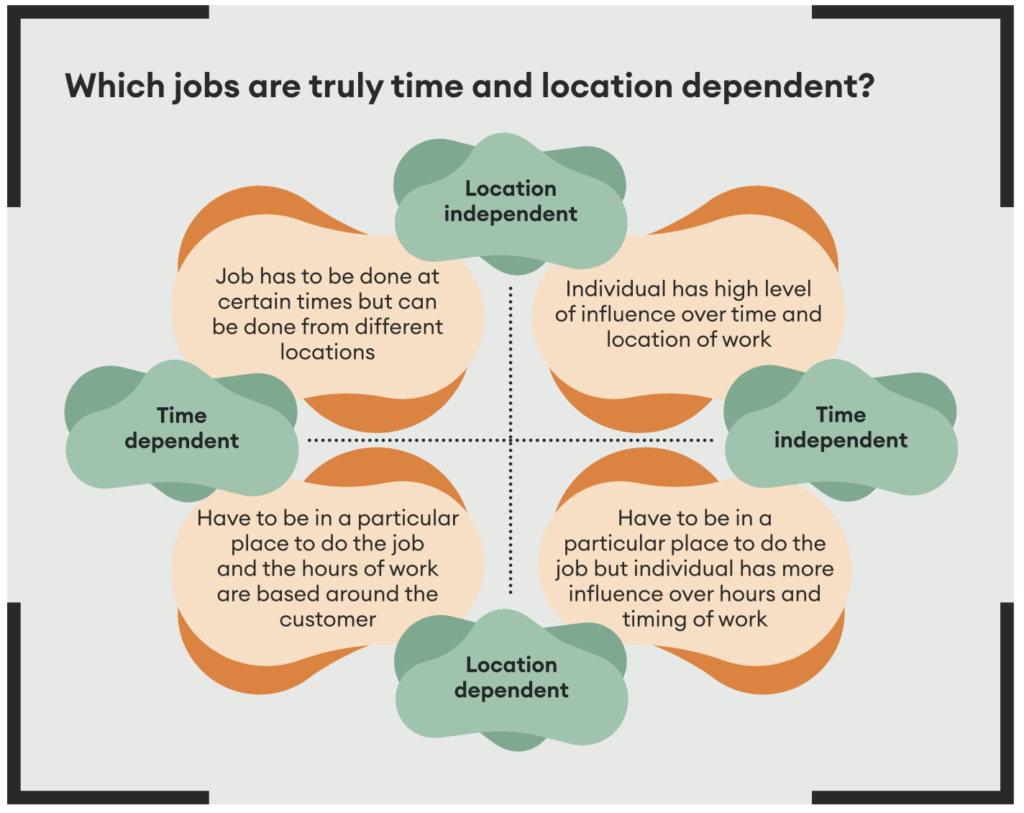 In the diagram above, I share a simple framework which I have been using to support several organizations to think through alternative approaches to managing the return to work after lockdown. It simply challenges businesses to ask which jobs can genuinely only be performed at a fixed location and at a fixed time, or whether some are rather more independent of time and location than has previously been conceded.