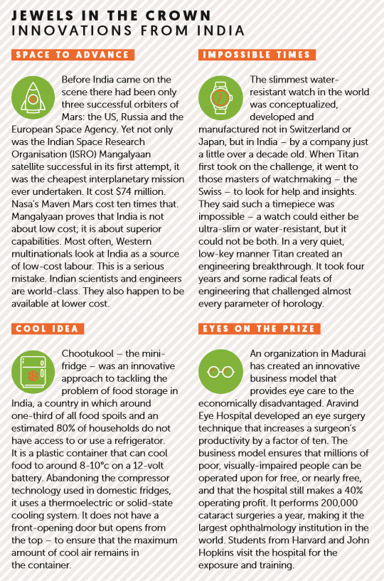 With a culture of creative improvisation, the mindset and skillset for frugal innovation are in abundance in India. Jugaad is a colloquial Hindi word that translates roughly as overcoming harsh constraints by improvising an effective solution using limited resources – tellingly, perhaps, English lacks a direct synonym. Jugaad is exemplified all over India, with diesel engines attached to carts to create trucks and other creative novelties. The jugaad mindset promotes the notion of seeking opportunity in adversity and doing more with less – both critical factors for frugal innovation.