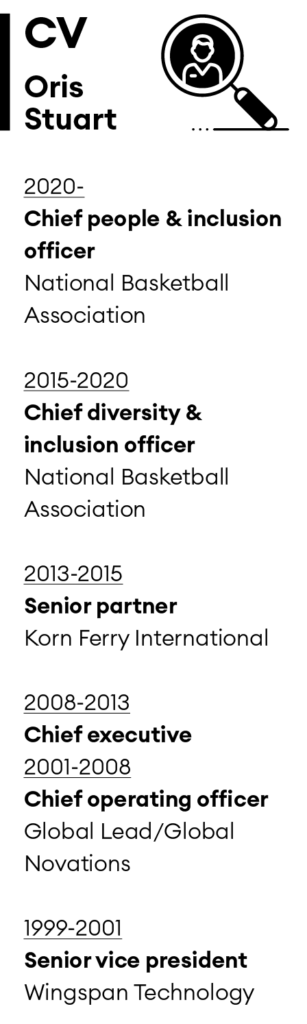 Five leagues sit within Stuart’s portfolio: the NBA, the WNBA, minor league the NBA G League, the e-sports NBA 2K League, and the newly formed Basketball Africa League. Stuart’s own position is fundamental to the NBA’s rapid shift towards becoming a DEI exemplar. As part of a fully integrated role, Stuart now oversees human resources for the organization alongside the design and execution of DEI strategies reaching across the five leagues.