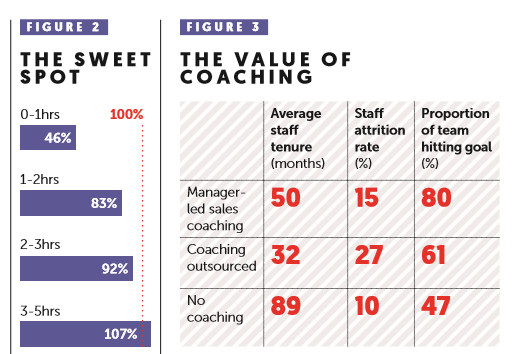 Past studies show three to five hours of quality skills coaching a month typically puts an underperforming seller over quota, while those who receive less than three hours underperform (see Figure 2). More than five hours yields a diminishing return.
