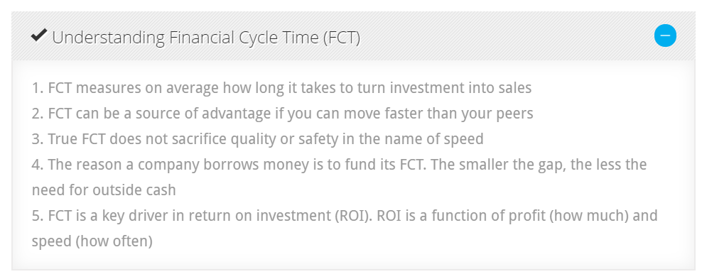To help measure the speed at which a company’s business model operates, we have developed an algorithm to measure this cycle using a company’s financial statements. The metric is called Financial Cycle Time (FCT).