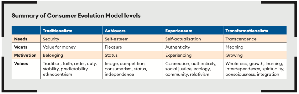 Meet Sarah. Raised in a conservative small town, she embodied the Traditional Consumer – frugal and practical. College flipped the script, ushering in the Achieving stage: a lawyer craving success, designer clothes and status-marking getaways. As she matured, she entered the Experiential stage, where connection and environmental consciousness guided her choices, favoring cycling, cultural travel and value-aligned brands. Finally, Sarah reached the Transformational stage: yoga and meditation fuel her desire for self-improvement and active contribution to social causes.