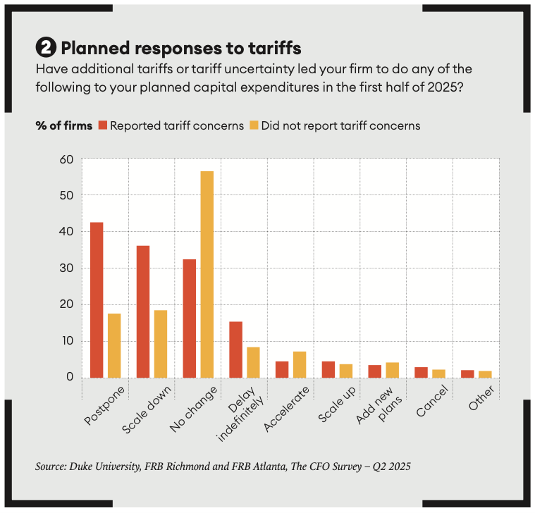 Certainly, in the short run, CFOs are very concerned about the tariffs. There are two components to that. One is the tariffs themselves – and the second is uncertainty about the tariffs. That’s reflected in our data. We ask CFOs an open-ended question: “What are your top concerns?” We give respondents a blank line, where they can write as much as they want; most put in maybe two concerns, sometimes three. This “blank line” approach is better than giving people a list where they can just check things off – our approach tells us what CFOs are right now thinking about.