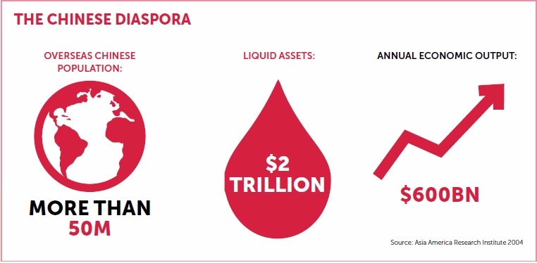 The diaspora consists of more than 50 million overseas Chinese in 160 countries, with an estimated $2 trillion of liquid assets and annual economic output of $600bn (see infographic). The power and potential of this external “bamboo network” is fully appreciated by the new leadership in Beijing, and represents a key resource in the process of China’s modernization and technological empowerment.
