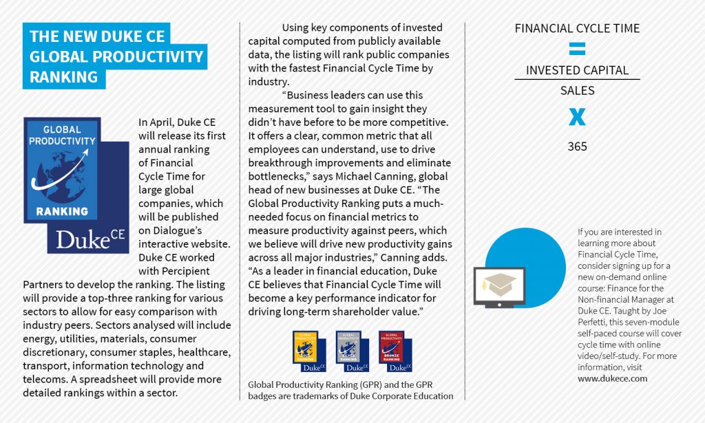 In April, Duke Corporate Education (Duke CE) will publish its inaugural annual Global Productivity Ranking based on the FCT of global firms. Firms now have an easy, standardized way to measure how their productivity compares to peers, using operational asset and liability figures from their balance sheets. Duke CE will group rankings based on nine of 11 sectors* from the Global Industry Classification Standard (GICS) system and will award a gold, silver and bronze medal to the firms in each of the sectors, based on the shortest FCT. In addition to the global leaders, the rankings will include a sortable database of public companies by sector to allow firms to compare themselves to a chosen set of peers.